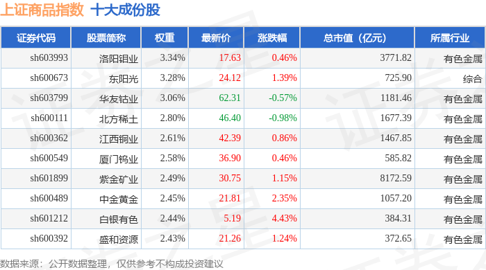 证券之星消息,12月10日,上证商品(000066)指数报收于3361.89点,涨0.41%,成交395.39亿元,换手率0.51%。当日该指数成份股中,上涨的有32家,白银有色以4.43%的涨幅领涨,下跌的有17家,合盛硅业以3.12%的跌幅领跌。
