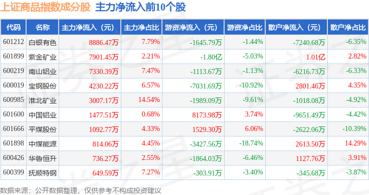 资金流向方面,上证商品(000066)指数成份股当日主力资金净流出合计19.55亿元,游资资金净流入合计3.53亿元,散户资金净流入合计16.02亿元。成份股资金流向详情见下表: