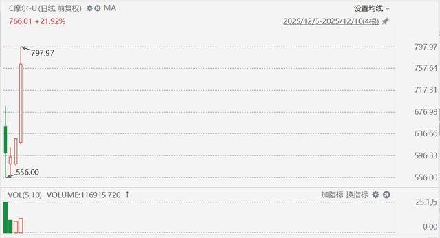 摩尔线程(688795.SH)午后涨幅进一步扩大至27%,报797.97元,再创上市新高,市值超3700亿元。摩尔线程为A股市场第三高价股,仅次于寒武纪和贵州茅台。