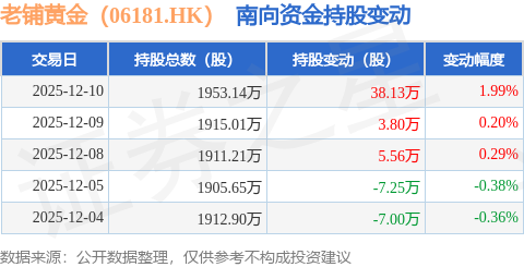 证券之星消息,12月10日南向资金增持38.13万股老铺黄金(06181.HK)。近5个交易日中,获南向资金增持的有3天,累计净增持33.25万股。近20个交易日中,获南向资金增持的有8天,累计净增持49.44万股。截至目前,南向资金持有老铺黄金(06181.HK)1953.14万股,占公司已发行普通股的13.63%。