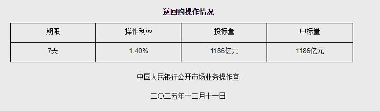 中新网12月11日电 据央行网站消息,2025年12月11日中国人民银行以固定利率、数量招标方式开展了1186亿元7天期逆回购操作。具体情况如下: