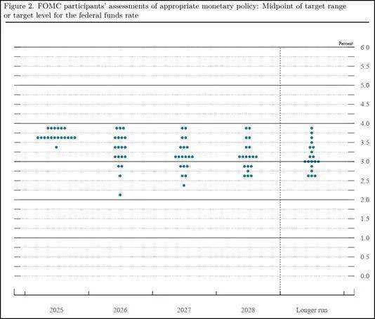 《经济预测摘要》(SEP)公布的“点阵图”显示,多数委员暗示明年的联邦基金利率大约在3.4%左右,这意味着政策制定者明年可能会再降息25个基点。对于2028年以后更长期的利率水平,美联储官员认为中性利率大约在3%。
