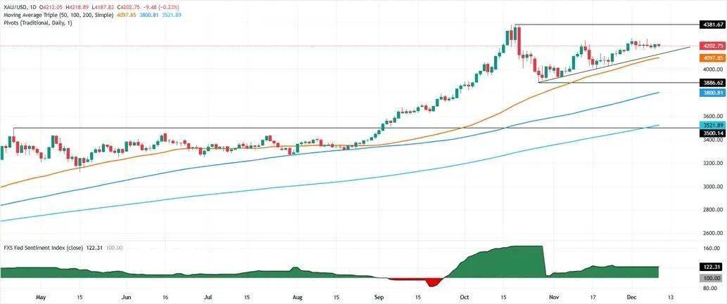 下行方面,Valencia补充道,如果金价跌破4200美元/盎司,下一道支撑位将是4153美元/盎司附近的20日简单移动均线(SMA),其后依次为4090美元/盎司附近的50日SMA以及4000美元/盎司整数关口。