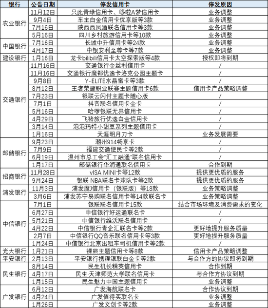 例如,7月16日,中国银行公告称,因业务调整,自2025年8月31日起,将停止发行部分信用卡产品,并调整信用卡产品卡面,共涉及24款信用卡产品,涵盖联名合作类、主题特色类等多个类别;11月3日,浦发银行发布公告称,因业务策略调整,将从2025年12月18日起停止发行浦发魔J信用卡(银联版)、浦发英雄联盟信用卡(亚索)等18款信用卡产品。