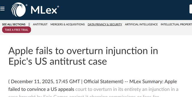 【环球网科技综合报道】12月12日消息,据MLeX报道,美国第九巡回上诉法院近日对苹果公司与游戏开发商Epic Games之间的长期法律纠纷作出最新裁决,部分推翻此前地方法院的相关制裁,允许苹果未来对iOS应用内通过链接引导至外部网站完成的购买(即"链接外购")收取"合理"佣金,但明确该佣金费率需由地方法院进一步确定或双方协商达成,苹果目前暂无法立即重启收费。