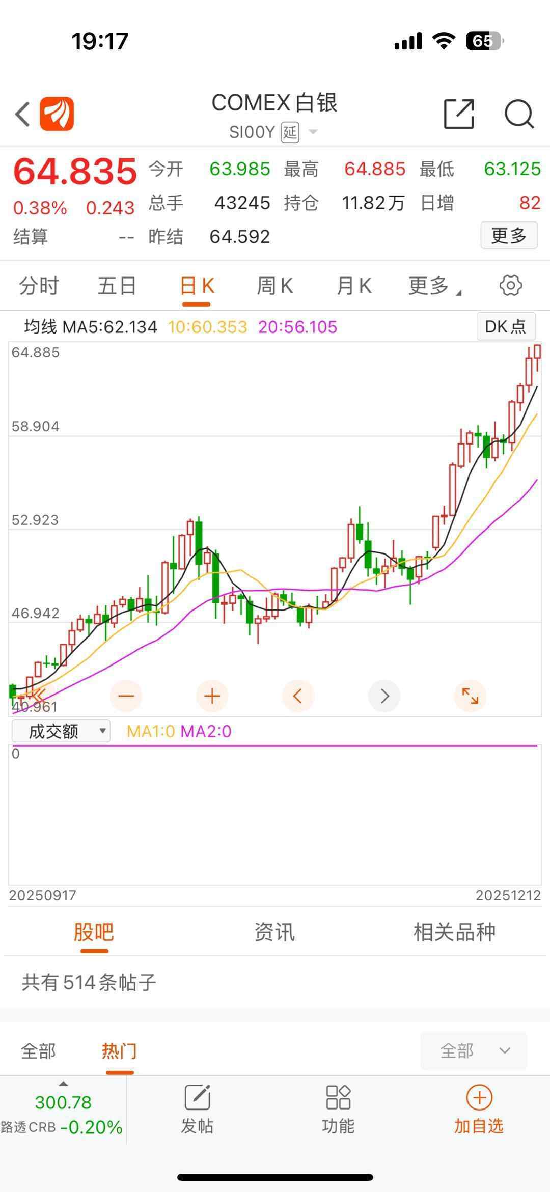 12月9日,现货白银首次突破每盎司60美元,站上新台阶;12月11日盘中触及64.31美元/盎司历史高位,最终实现年度翻倍涨幅。