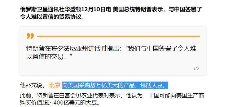 12月10日,据俄罗斯卫星通讯社报道,特朗普在宾夕法尼亚州一场演讲时宣称:他们跟中国达成了令人难以置信的交易,中国向美国采购数万亿美元的产品,其中包括大豆。