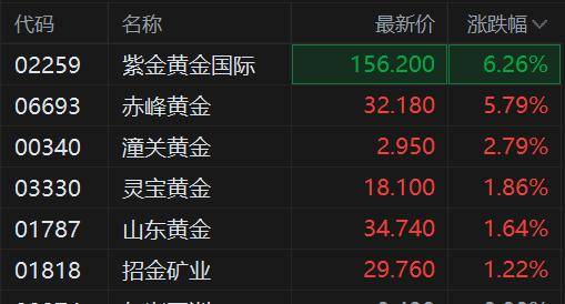 港股黄金股盘初拉升走强,其中,紫金黄金国际涨超6%领衔,赤峰黄金涨5.8%,潼关黄金涨近3%,灵宝黄金、山东黄金、招金矿业均涨超1%。