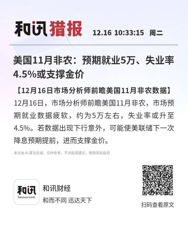 【12月16日市场分析师前瞻美国11月非农数据】12月16日,市场分析师前瞻美国11月非农,市场预期就业数据疲软,约为5万左右,失业率或升至4.5%。若数据出现下行意外,可能使美联储下一次降息预期提前,进而支撑金价。