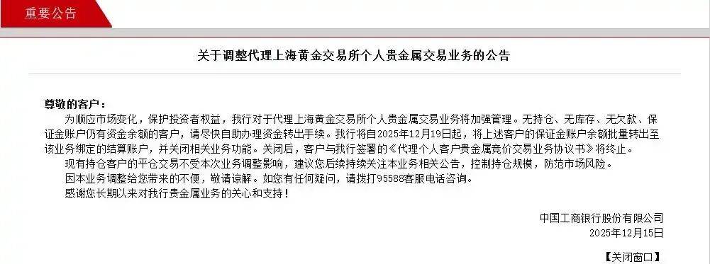 12月15日,工商银行官网发布 《关于调整代理上海黄金交易所个人贵金属交易业务的公告》称:“无持仓、无库存、无欠款、保证金账户仍有资金余额的客户,请尽快自助办理资金转出手续。”自2025年12月19日起,将上述客户的保证金账户余额批量转出至该业务绑定的结算账户,并关闭相关业务功能。