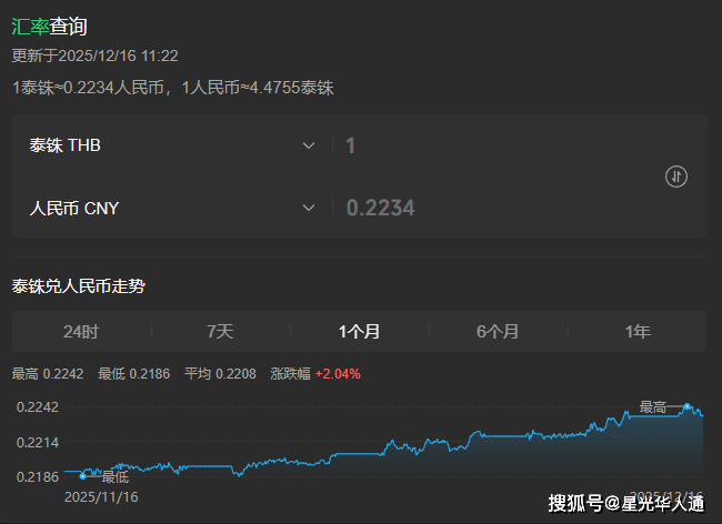 1泰铢≈0.2234人民币,1人民币≈4.4755泰铢