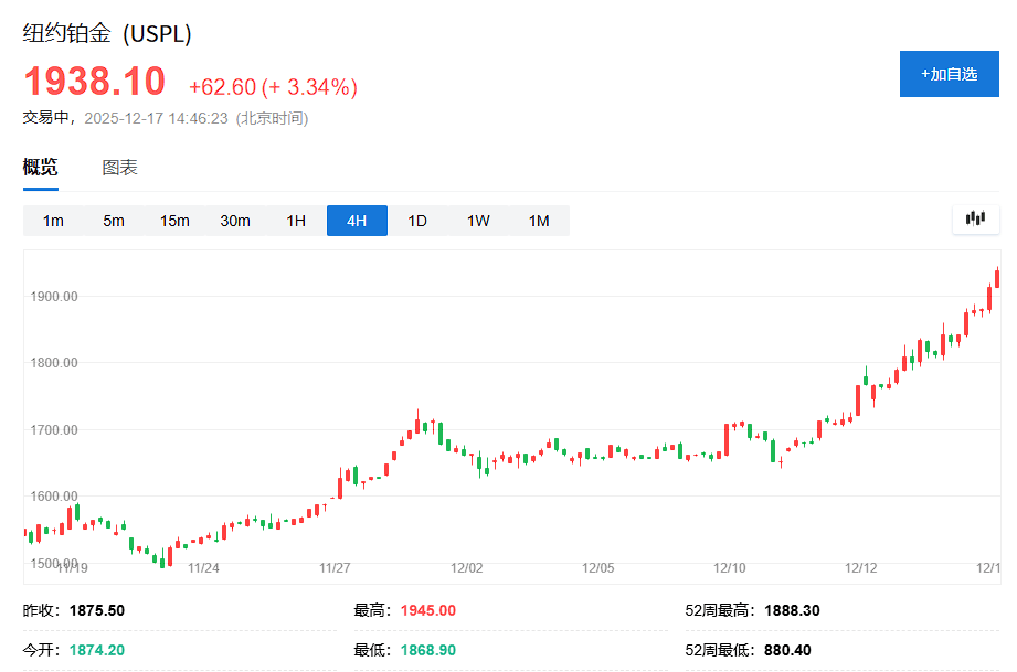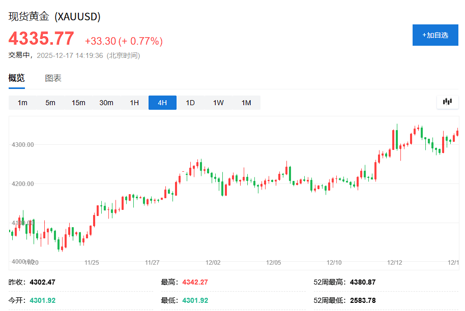今天,贵金属市场表现尤为抢眼,金价目前已回升至每盎司4330美元上方,结束了上一交易日的短暂回调,距离10月创下的4381美元历史高点仅咫尺之遥。