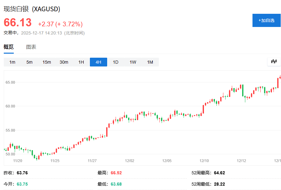 现货黄金上涨0.77%至每盎司4,335.77美元;现货白银上涨3.72%至每盎司66.13美元;