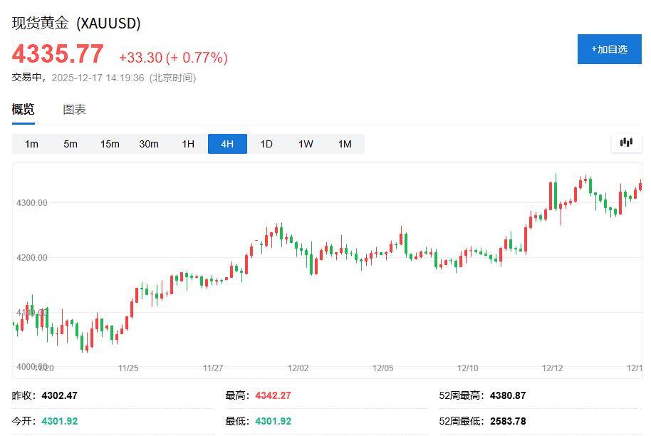 今天,贵金属市场表现尤为抢眼,金价目前已回升至每盎司4330美元上方,结束了上一交易日的短暂回调,距离10月创下的4381美元历史高点仅咫尺之遥。