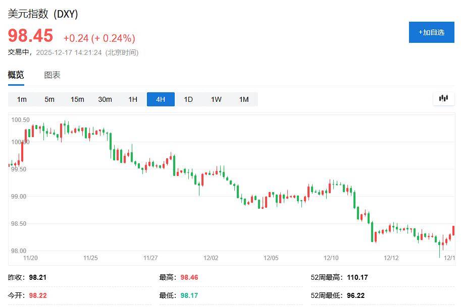 周三(12月17日),亚太股市普遍下跌,美股期货小幅走低,因地缘政治紧张局势升级,推动资金涌向黄金、白银等商品,其中白银再创新高,黄金再度逼近10月创下历史高位。国际油价显著反弹,WTI原油和布特原油均涨超1%。美元指数延续涨势,日内涨超0.2%。