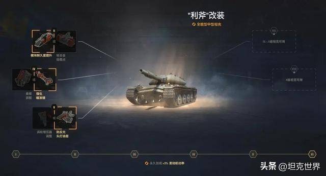 在战地升级方面,可以参考上图方案进行选择。利斧属于“全能型中型坦克”。该车在战地改装达到满级后,可以获得额外的3%坦克发动机功率,还可以增加多项性能升级与1项配件加成栏位选择。性能改装玩家可以选择模块耐久度提升、强化瞄准镜、防反光头灯涂层以加强坦克战斗力,具体选择按照玩家战斗风格微调。
