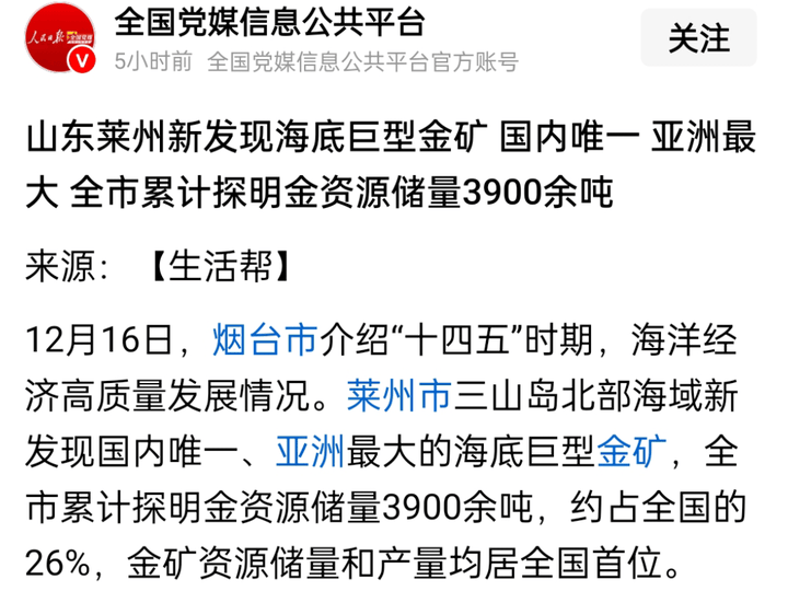 消息来源:全国党媒公共信息平台12月17日报道《山东莱州发现巨型海底金矿,国内唯一,亚洲最大,全市黄金储量占全国26%》