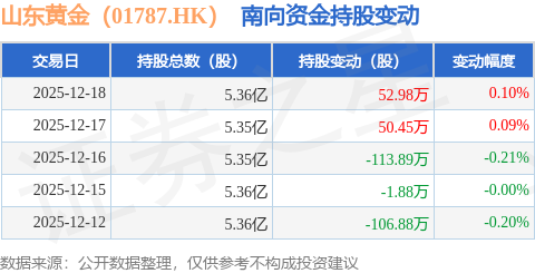 证券之星消息,12月18日南向资金增持52.98万股山东黄金(01787.HK)。近5个交易日中,获南向资金减持的有3天,累计净减持119.22万股。近20个交易日中,获南向资金减持的有14天,累计净减持1568.33万股。截至目前,南向资金持有山东黄金(01787.HK)5.36亿股,占公司已发行普通股的53.8%。