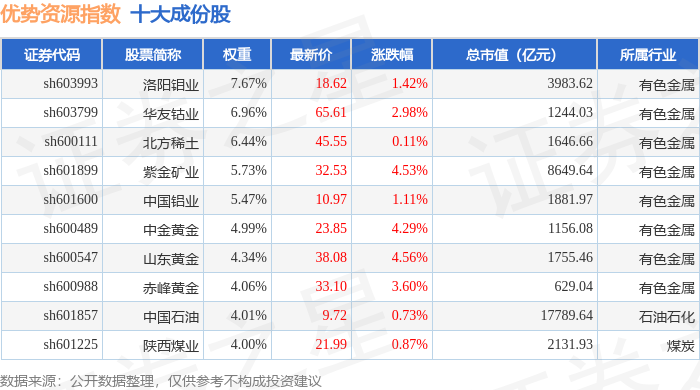 证券之星消息,12月22日,优势资源(000145)指数报收于7891.54点,涨1.92%,成交510.02亿元,换手率0.72%。当日该指数成份股中,上涨的有29家,白银有色以10.04%的涨幅领涨,下跌的有10家,淮北矿业以1.89%的跌幅领跌。