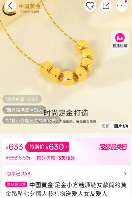 就拿做品牌特卖的唯品会来说,在平台上,消费者可以找到周生生、中国黄金等主流品牌的黄金饰品,平台的折扣优惠与简洁的购买规则,让消费者在应对金价波动时多了一份从容。例如原价962的中国黄金足金小方糖项链,如今最低630就能入手,便宜了300多块,受到了不少消费者的青睐。