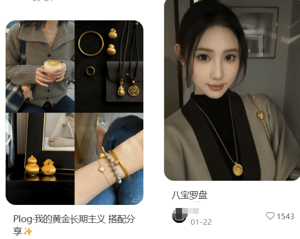 从社交平台上来看,不少网友也都晒出了自己的“黄金佩戴攻略”。有做成项链戴在脖子上的,有打成手环戴在手上的,还有“1细+1粗”职场叠戴公式……这些由用户共创、被品牌吸纳的潮流,使得黄金佩戴摆脱了“暴发户”或“长辈礼物”的刻板印象,变得时髦、轻盈。