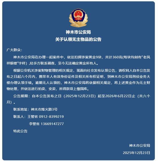 根据公安机关涉案财物管理的相关规定,现面向社会发布认领公告,请权利人自本公告发布之日起六个月内,携带本人有效身份证件及相关所有权证明,到神木市公安局刑侦业务大楼办理认领手续。逾期无人认领的,神木市公安局将依据相关规定,将上述黄金作为无主财物处理,并依法进行拍卖、变卖,所得款项上缴国库。