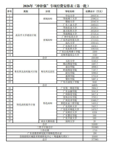 12月24日,广东省教育厅公布《关于2026年高等教育“冲一流、补短板、强特色”专项资金安排方案(第一批)的公示》,拟安排37.7985亿元支持34所高校“冲补强”。
