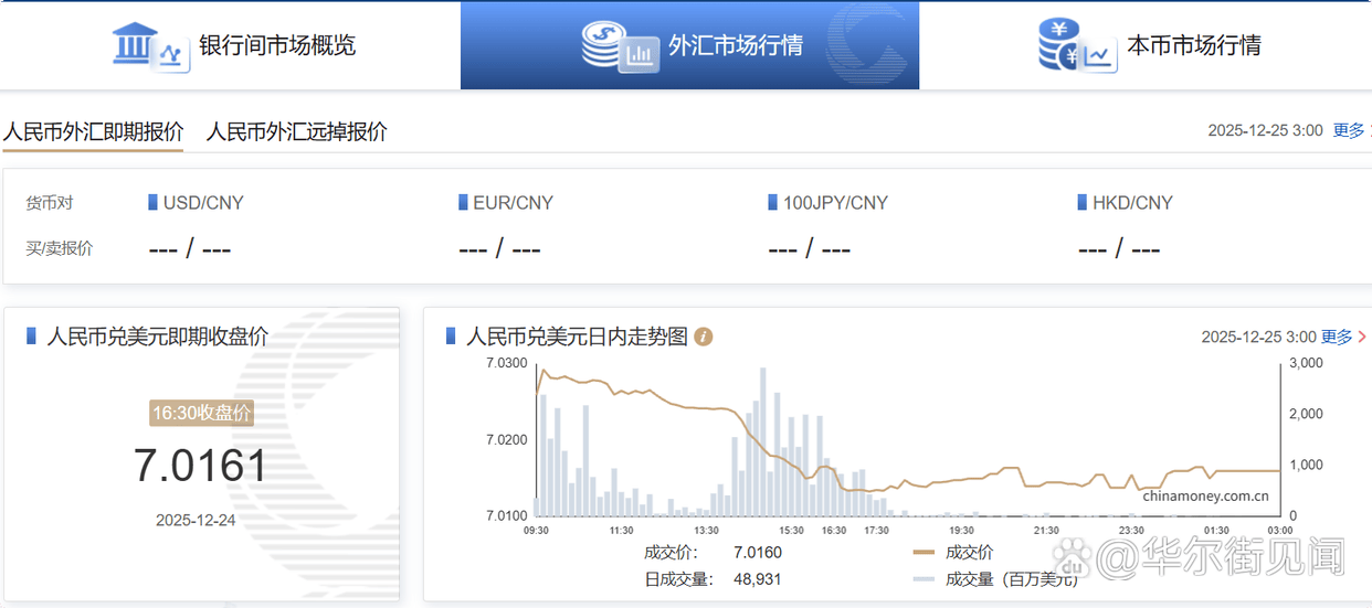 在岸人民币兑美元(CNY)北京时间03:00收报7.0160元,较周二夜盘收盘涨120点。成交量489.31亿美元。