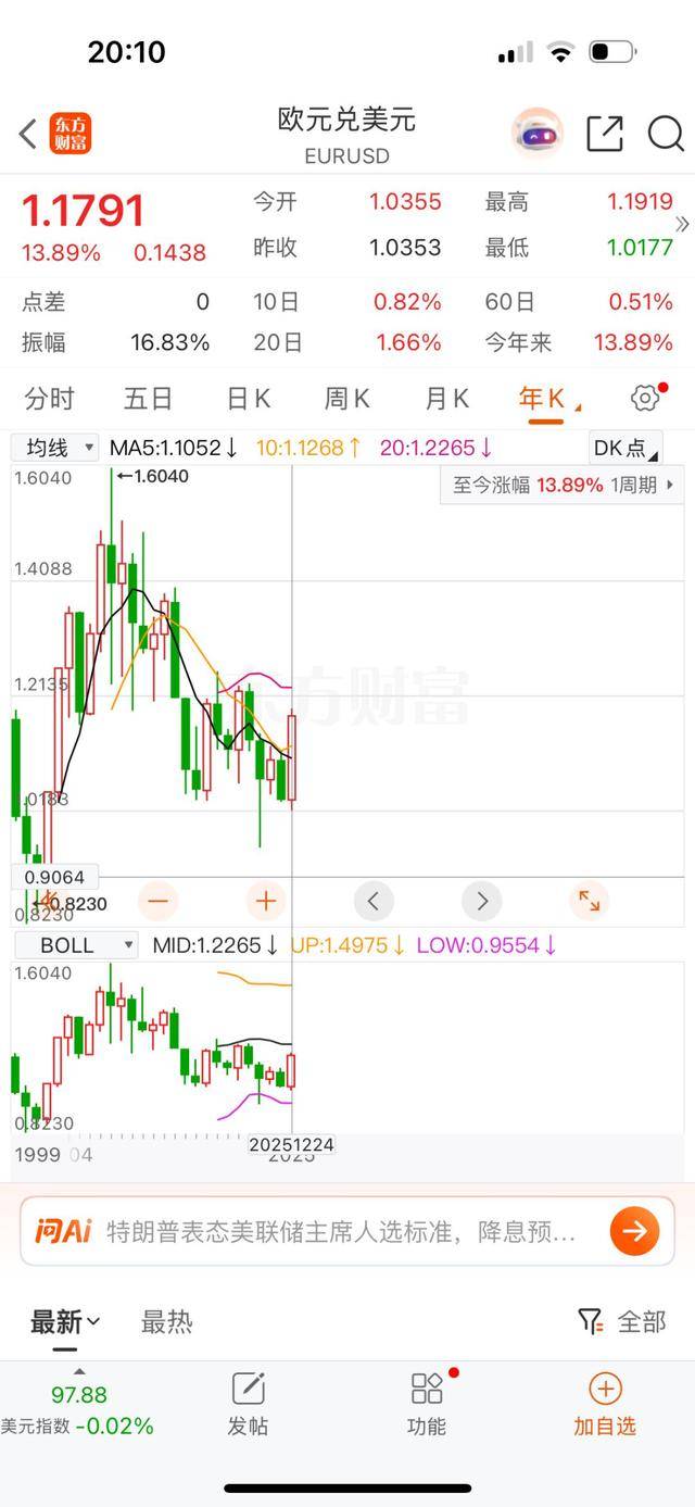 今年以来欧元对美元涨幅13.89%