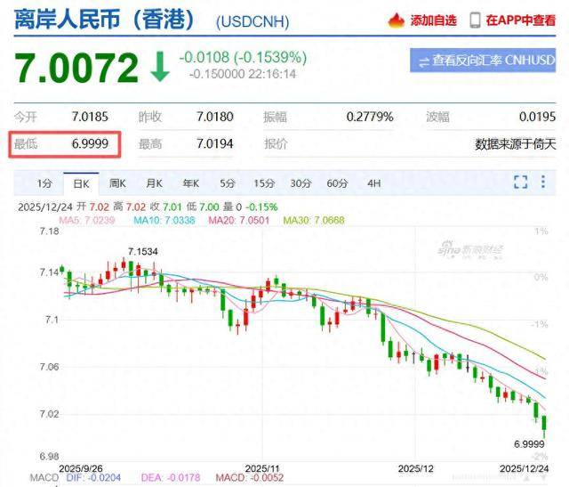 据新华财经最新消息:人民币汇率涨势不断,12月24日晚间,离岸人民币兑美元一度升破7.0关口。