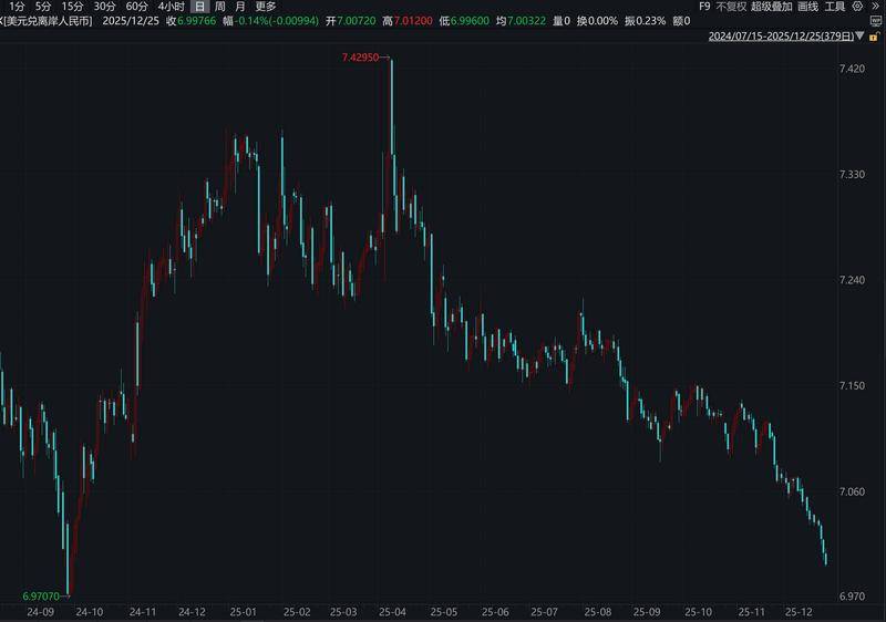 12月25日,离岸人民币对美元升破7.0关口,为2024年9月以来首次;在岸人民币最高升至7.0061。