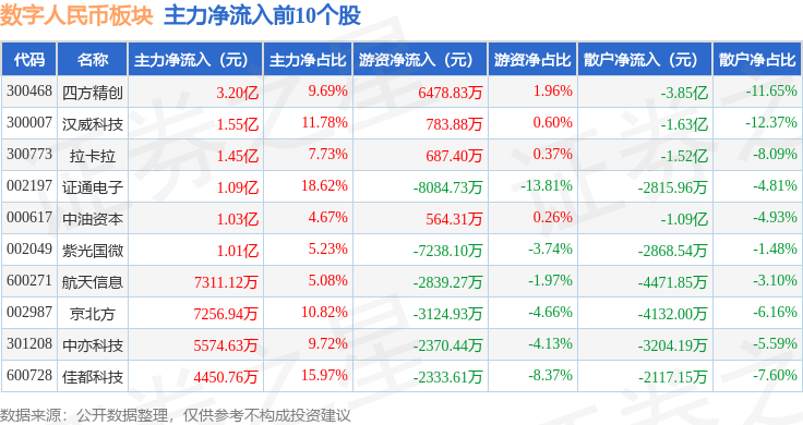 从资金流向上来看,当日数字人民币板块主力资金净流入4.0亿元,游资资金净流入3484.25万元,散户资金净流出4.35亿元。数字人民币板块个股资金流向见下表: