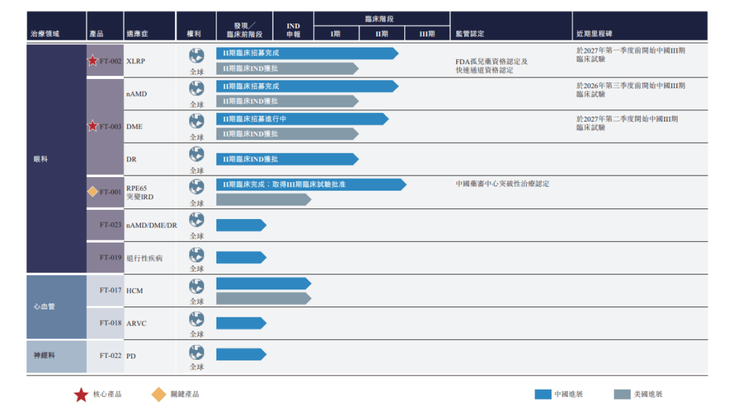 FT-002是芳拓生物的核心管线之一,这是一种正在研究用于治疗X连锁视网膜色素变性(XLRP)的潜在全球同类最佳候选药物。FT-003是一款潜在全球同类最佳候选药物,正在研究用于透过玻璃体内注射治疗新生血管性老年性黄斑病变(nAMD)及糖尿病黄斑水肿(DME)。招股书显示,两款药物在中国的二期临床招募完成,其中FT-003的nAMD适应证于2026年第三季度前开始中国三期临床试验。