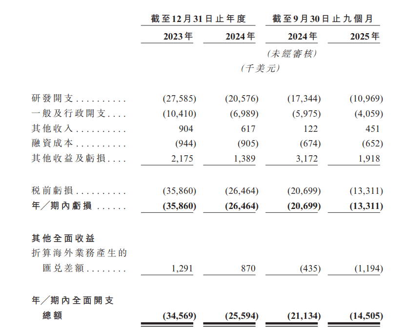 目前,芳拓生物还没有商业化产品。业绩方面,截至2023年及2024年12月31日止年度,公司期内亏损分别为3590万美元、2650万美元,2025年前九个月录得亏损1330万美元。此次港股募资拟用于两款核心产品的持续临床研发活动,以及早期管线项目的研发等。