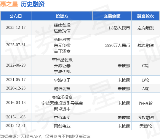 证券之星消息,根据天眼查APP于12月17日公布的信息整理,宁波惠之星新材料科技股份有限公司定向增发融资,融资额1.8亿人民币,参与投资的机构包括经纬创投,远致瑞信。