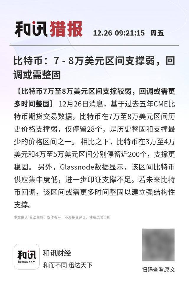 【比特币7万至8万美元区间支撑较弱,回调或需更多时间整固】12月26日消息,基于过去五年CME比特币期货交易数据,比特币在7万至8万美元区间历史价格支撑弱,仅停留28个,是历史整固和支撑最少的价格区间之一。 相比之下,比特币在3万至4万美元和4万至5万美元区间分别停留近200个,支撑更稳固。 另外,Glassnode数据显示,该区间比特币供应集中度低,进一步印证支撑不足。若未来比特币回调,该区间或需更多时间整固以建立强结构性支撑。