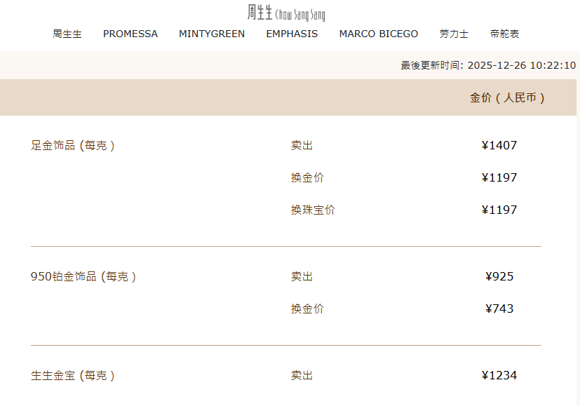 中新经纬查询国内品牌金价。周生生足金饰品标价1407元/克,较前一日1397元/克的价格上涨10元/克。 老凤祥足金饰品标价1413元/克,较前一日1398元/克的价格上涨15元/克。