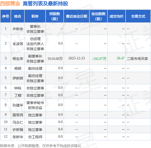 西部黄金近半年内的董监高及核心技术人员增减持详情如下:
