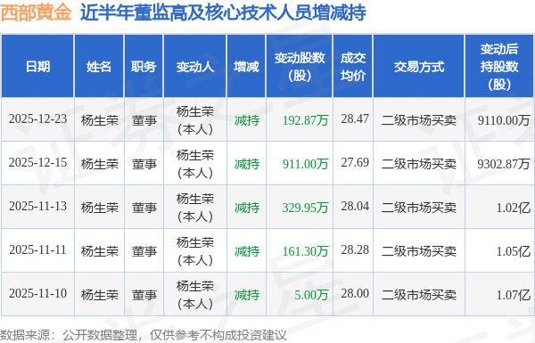 证券之星消息,根据12月26日市场公开信息、上市公司公告及交易所披露数据整理,西部黄金(601069)最新董监高及相关人员股份变动情况:2025年12月23日公司董事杨生荣共减持公司股份192.87万股,占公司总股本为0.2117%。变动期间公司股价上涨1.54%,12月23日当日收盘报28.43元。
