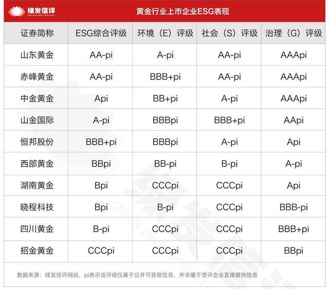 绿发信评主动评级结果显示,山东黄金和赤峰黄金获行业最高的AA-pi评级;中金黄金获Api评级;山金国际获A-pi评级;恒邦股份获BBB+pi评级;西部黄金获BBpi评级;湖南黄金和晓程科技获评Bpi评级;四川黄金获B-pi评级;招金黄金获CCCpi评级。