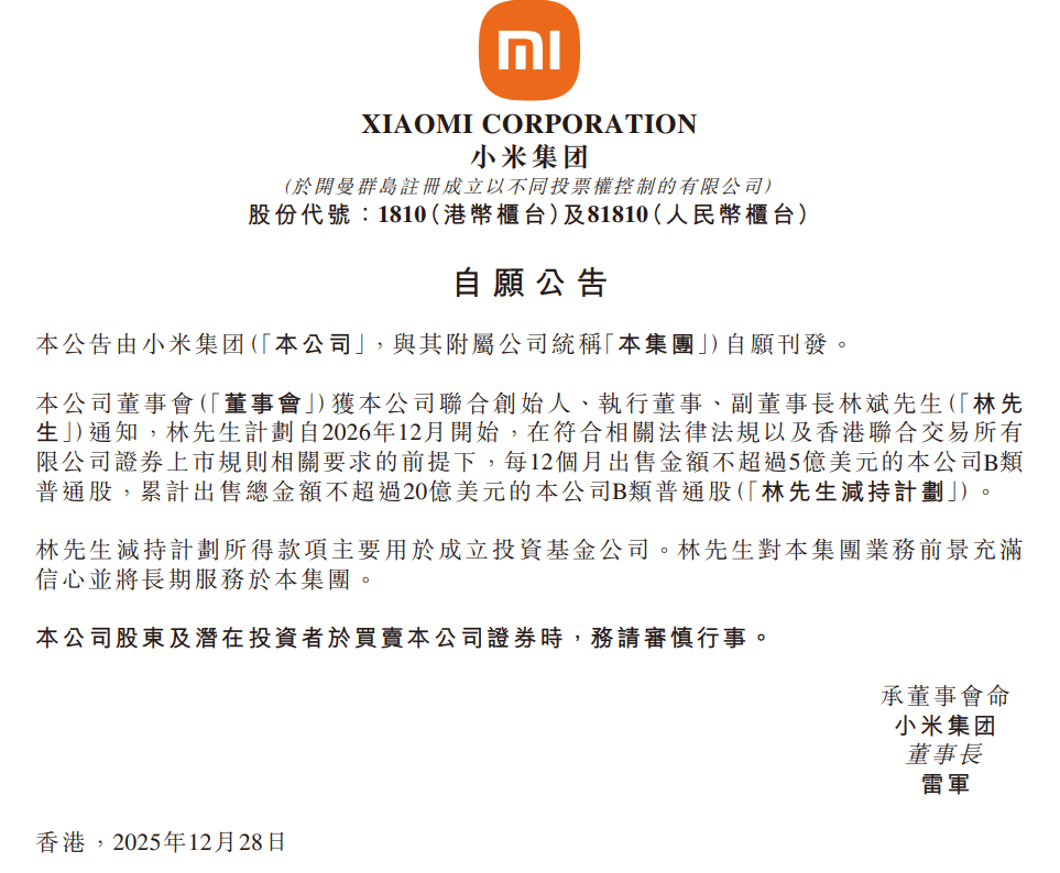 12月28日,小米集团在港交所发布公告称,公司联合创始人、执行董事、副董事长林斌计划自2026年12月开始,每12个月出售金额不超过5亿美元的公司B类普通股,累计出售总金额不超过20亿美元。