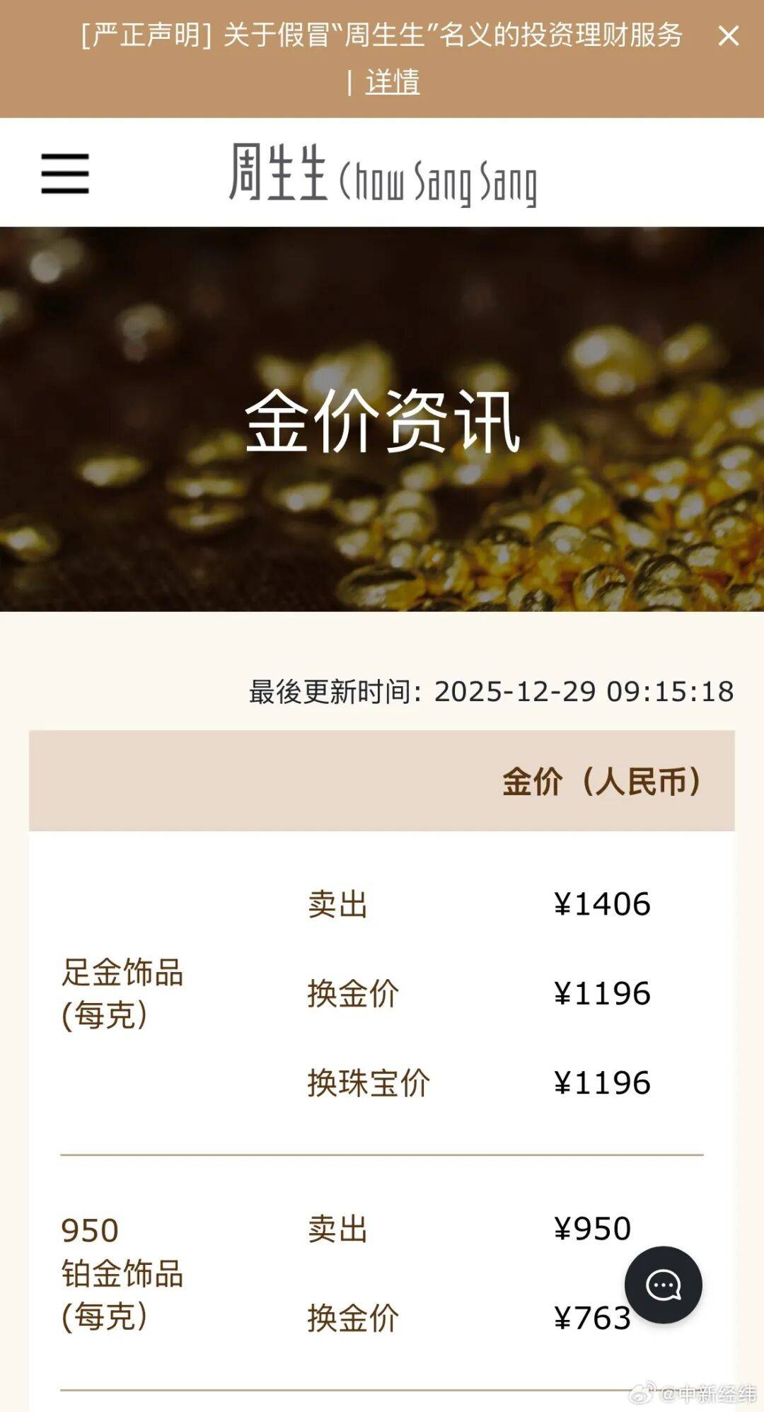 国内品牌金饰价格同步走低,中新经纬记者查询到,周生生足金饰品报价1406元/克,较27日1412元/克跌6元/克。