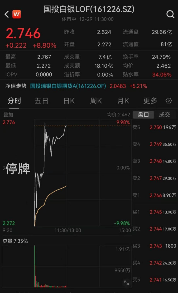 1229日,国投白银LOF复牌后出现大幅波动,直线跌停后又快速拉升,二十分钟左右逼近涨停,随后震荡回落。截至午间收盘,二级市场报价2.746元,涨幅达8.8%,溢价率为34.06%