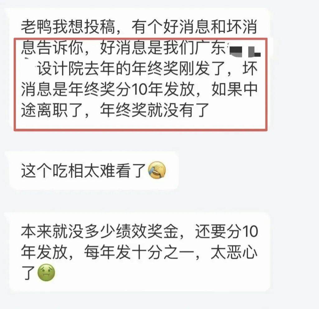 说的是有广东一家设计院,去年的年终奖刚发,但是要分10年发放。如果中途离职,年终奖就没了。