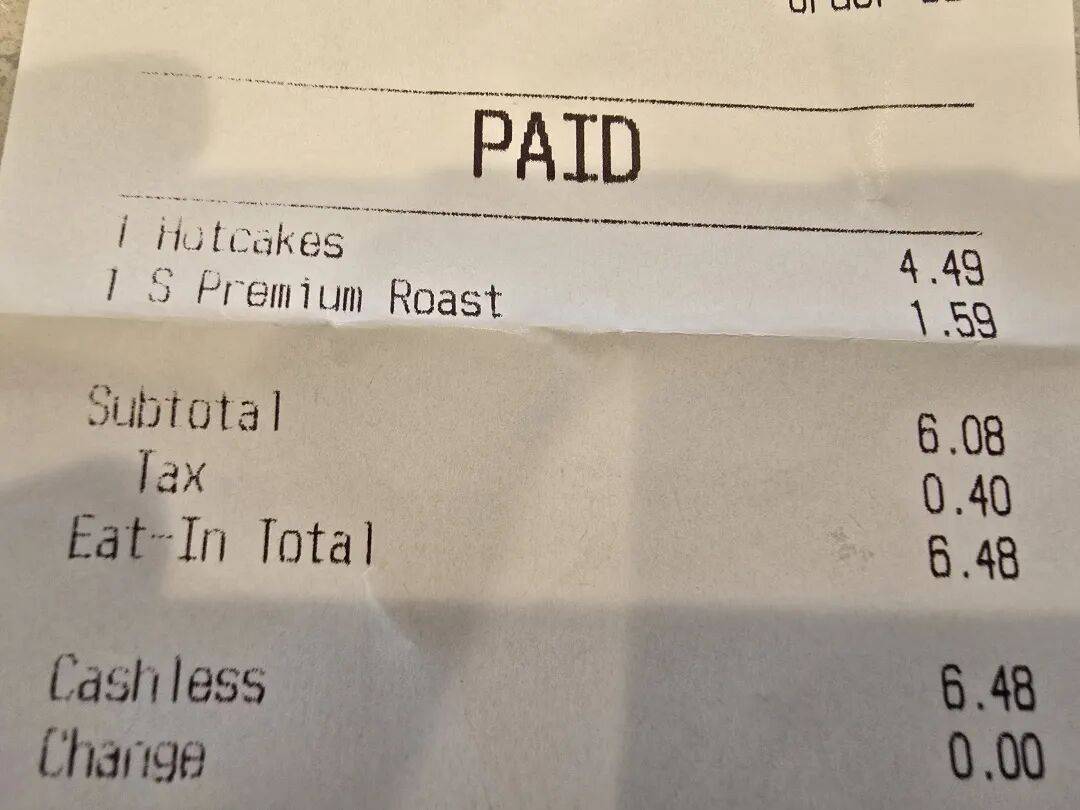 蛋饼的价格出来了。我一看,哎哟,比去年又涨了一毛钱。前年一份蛋饼是4.29美元,去年一份蛋饼是4.39美元,今年涨到4.49美元。