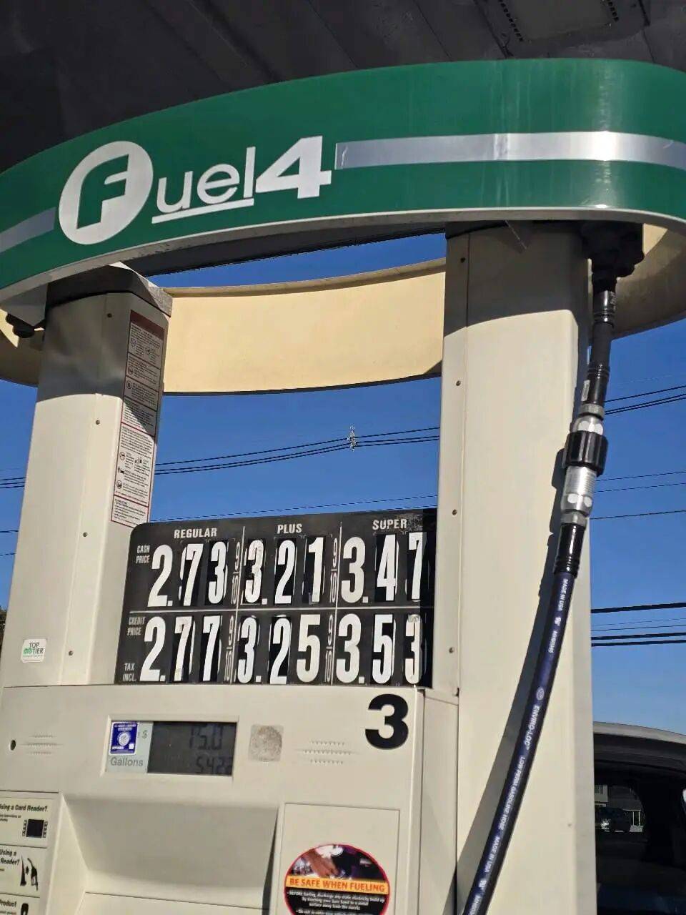 2025年,美国的油价非常平稳。我印象中这个加油站没有超过3美元的时候。今天的油价如果现金支付,是2.7399美元一加仑,与去年一模一样。这是8年来第一次汽油价格与上一年相同。