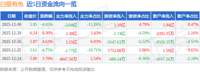 证券之星消息,截至2025年12月30日收盘,白银有色(601212)报收于5.95元,下跌4.65%,换手率5.28%,成交量391.33万手,成交额22.95亿元。