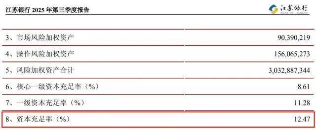 然而,在这些亮眼数据的背后,江苏银行的资本充足率却拉响了警报。截至2025年9月末,其核心一级资本充足率已降至8.61%,较去年末下降0.51个百分点。