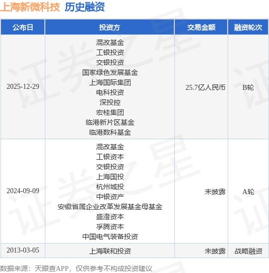 证券之星消息,根据天眼查APP于12月29日公布的信息整理,上海新微科技集团有限公司B轮融资,融资额25.7亿人民币,参与投资的机构包括混改基金,工银投资,交银投资,国家绿色发展基金,上海国际集团,电科投资,深投控,宏桂集团,临港新片区基金,临港数科基金。