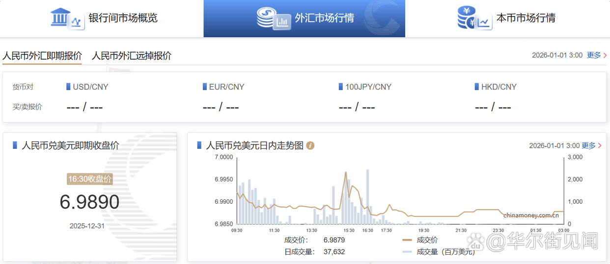 在岸人民币兑美元(CNY)北京时间03:00收报6.9879元,较周二夜盘收盘涨63点。成交量376.32亿美元。